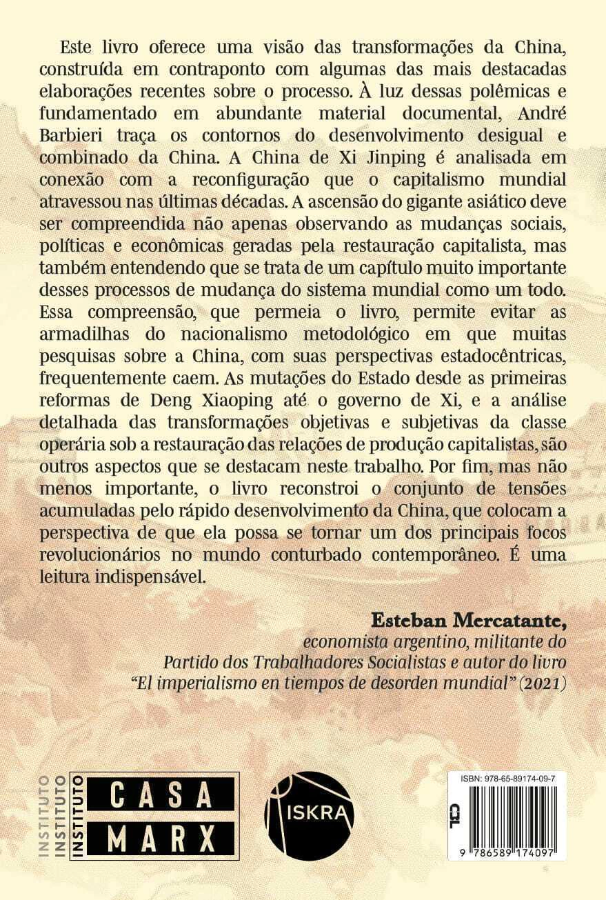 Nesta obra, o leitor encontrará uma análise materialista histórica do desenvolvimento moderno da China; a formação de sua classe trabalho nas circunstâncias particulares da política colonial ocidental; as revoluções e contrarrevoluções chinesas; os debates de estratégia que atravessaram o turbulento século XX; o papel do Partido Comunista Chinês ontem e hoje; e a necessidade de recuperar, de maneira criativa e inovadora, a teoria da revolução permanente, a hegemonia operária e a estratégia soviética no complexo tabuleiro da crise econômica internacional. Para isso, André Barbieri reconstroi os fundamentos teóricos do debate marxista à luz das interpretações de uma gama de intelectuais, clássicos e contemporâneos, que se ocuparam da China: Giovanni Arrighi, Perry Anderson, Alain Badiou, Domenico Losurdo, Isabella Weber, Michael Roberts, Slavoj Žižek, entre outros. Nesta rica composição de mosaicos, emerge uma visão nova sobre a possibilidade de reconstruir um imaginário socialista no século XXI, ligado à poderosa classe trabalhadora chinesa e à luta de classes na Ásia e em todo o mundo.